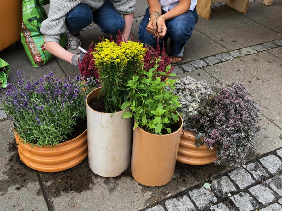"Haverne" er skabt af affaldsmateriale, PVC rør, der med deres forskellige diameter blev til smukke bede med krydderurter, blomster og et lille ærteri.